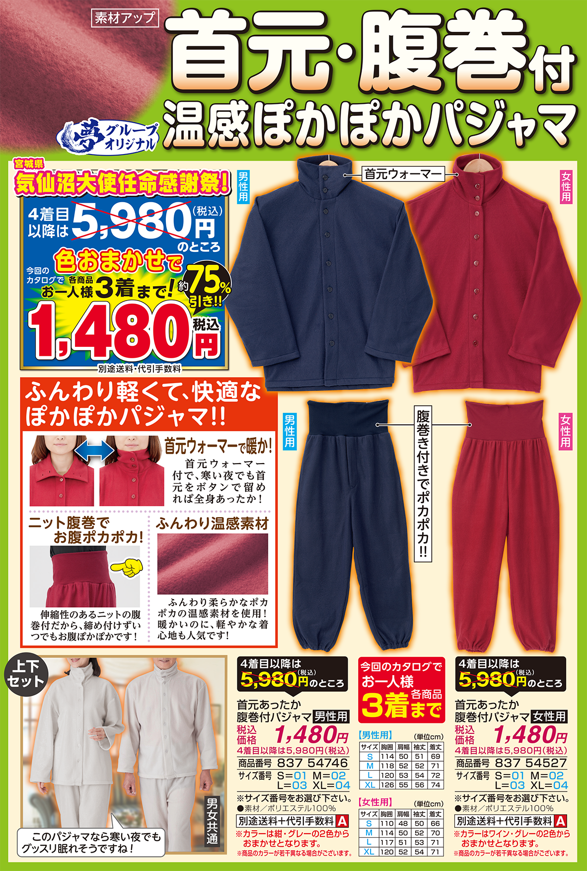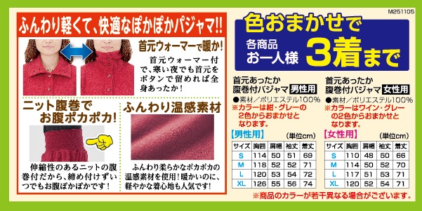 「首元・腹巻付温感ぽかぽかパジャマ」
