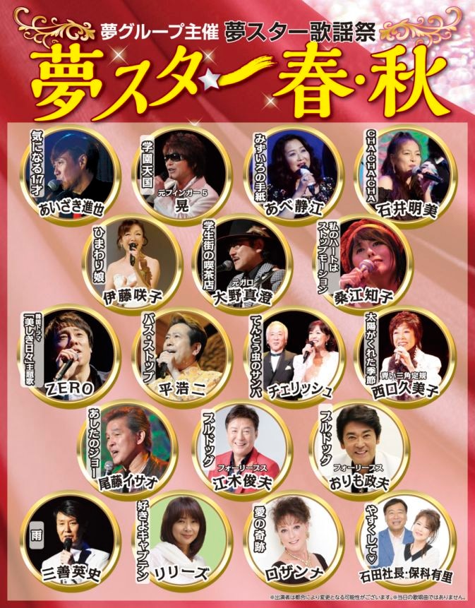 あいざき進也/晃/石井明美/伊藤咲子/大野真澄/桑江知子/ZERO/平浩二/江木俊夫/おりも政夫/三善英史/リリーズ/ロザンナ/石田社長/保科有里